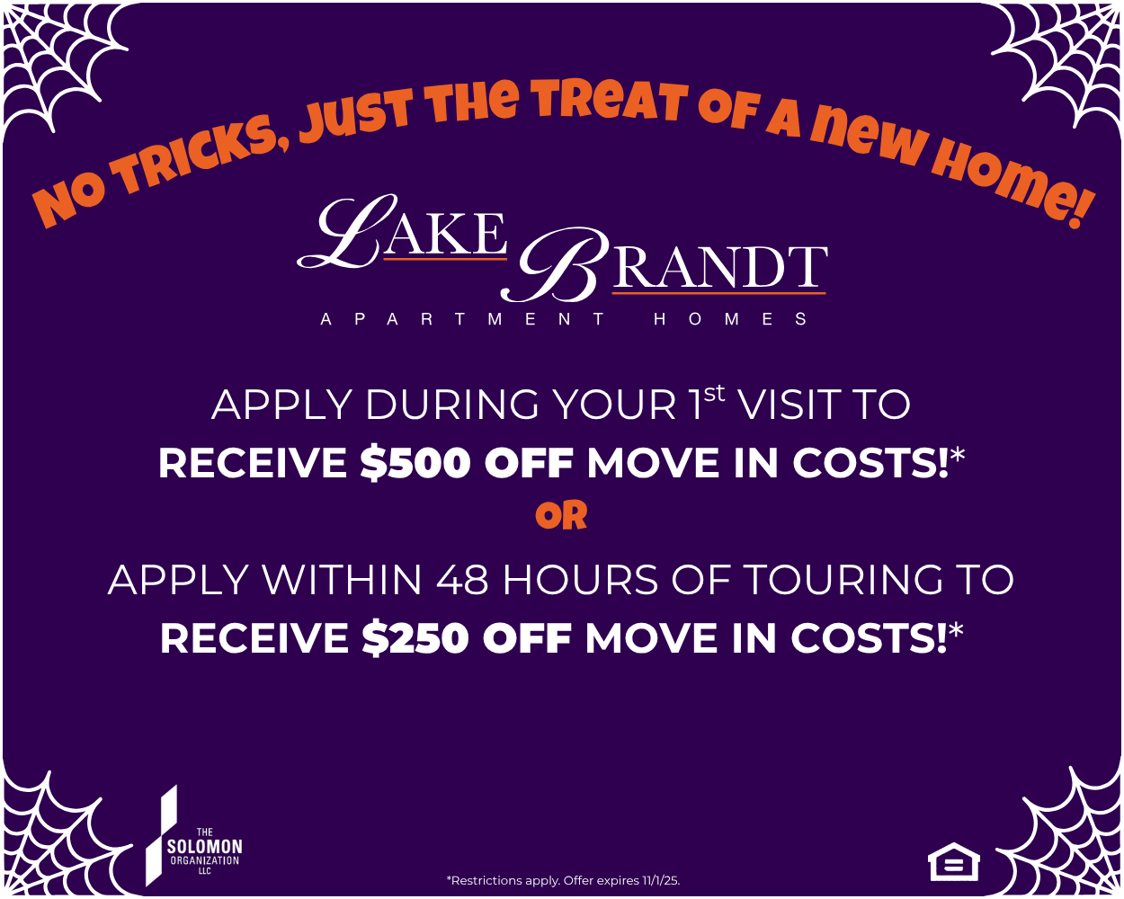 Apply during your first visit to Lake Brandt Apartment Homes and receive $500 off move-in costs!* Or, apply within 48 hours of your tour to save $250 off move-in costs!*
