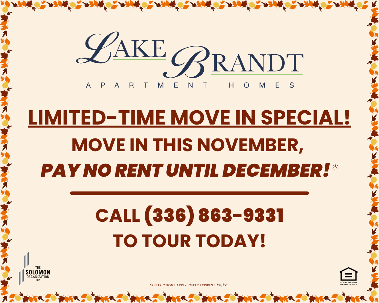 Move in this November and pay no rent until December!* Enjoy comfortable apartment living, spacious floor plans, and resort-style amenities — all in a convenient Greensboro location! Call to schedule your tour today!