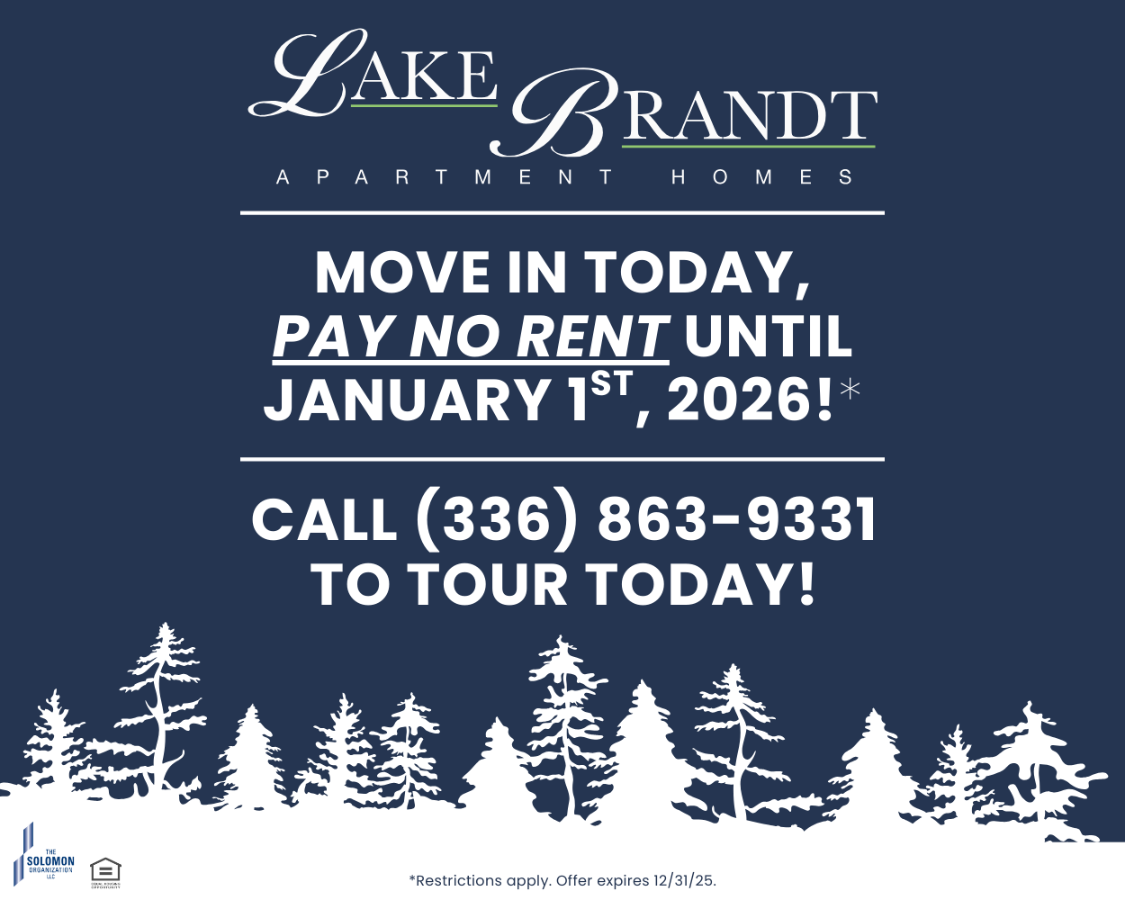 Move in today and enjoy your new home rent-free until January 1st, 2026*. Lake Brandt Apartment Homes offers a convenient location, spacious floor plans, and a community designed for comfortable living. This limited-time offer gives you the chance to get settled now without paying rent until the new year. Call us if you would like details or want to schedule a tour.